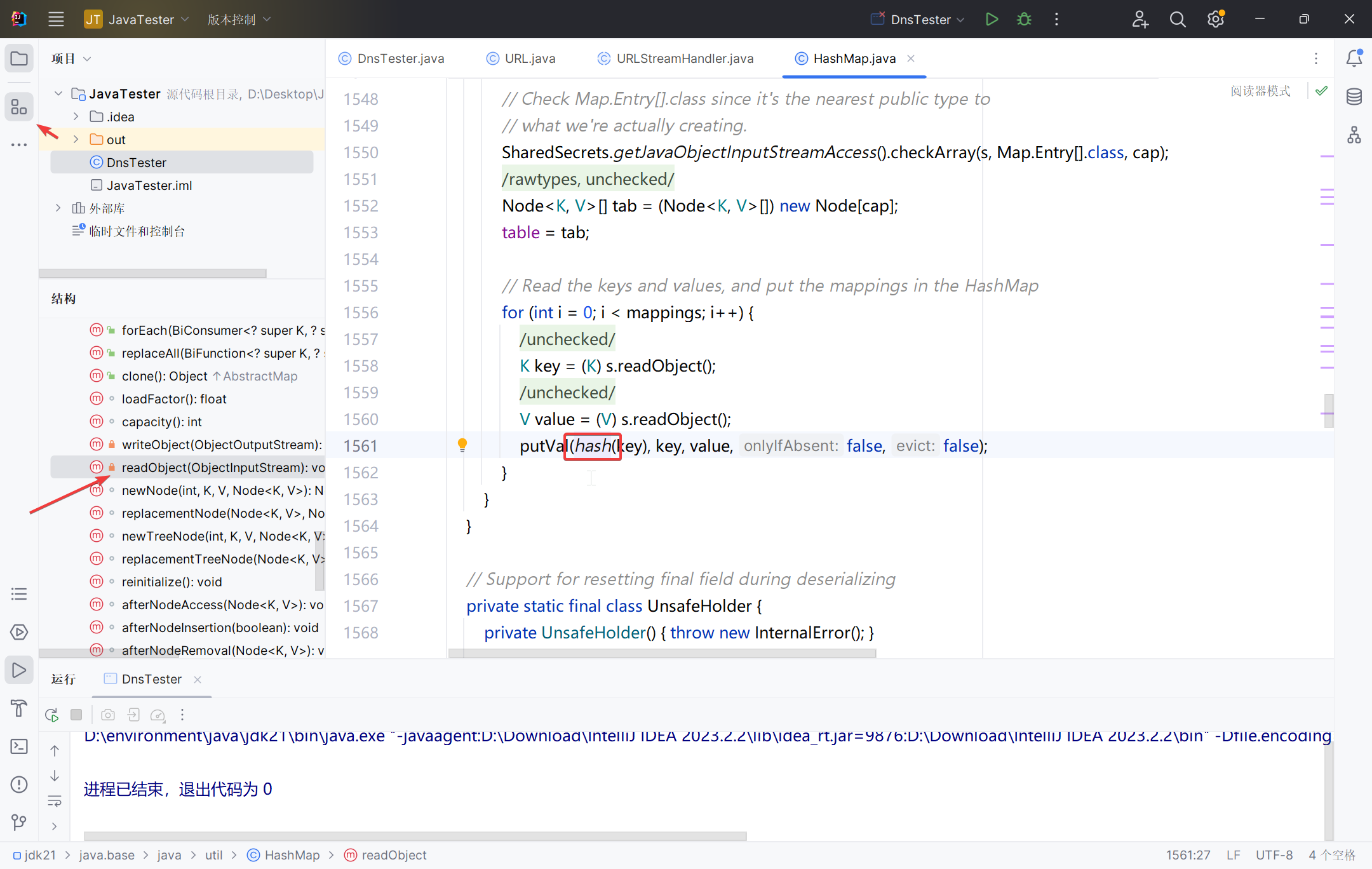 点击查看结构窗口,然后找到readObject方法,找到下面有一个hash方法加密key