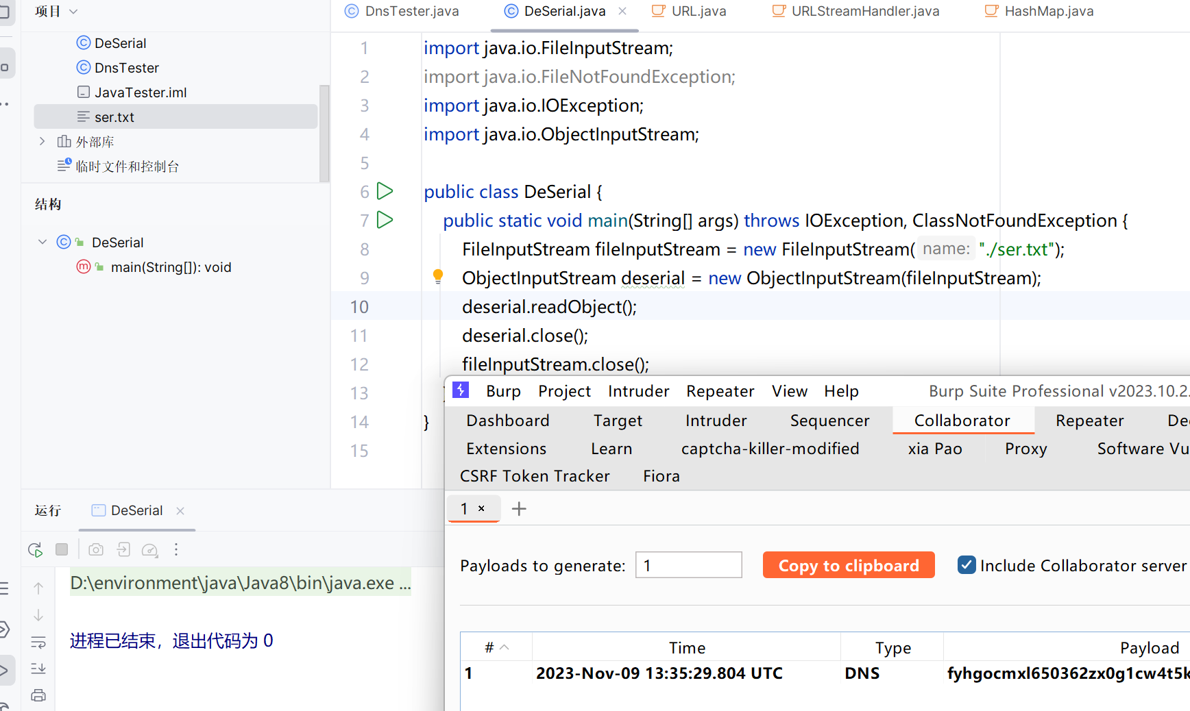 1 2 3 4 5 6 7 8 9 10 11 12 import java.net.MalformedURLException; import java.net.URL; import java.util.HashMap; public class DnsTester { public static void main(String[] args) throws MalformedURLException { HashMap list = new HashMap<>();//新建HashMap对象 URL host = new URL("http://yp1vwv.dnslog.cn"); list.put(host,"22"); } }