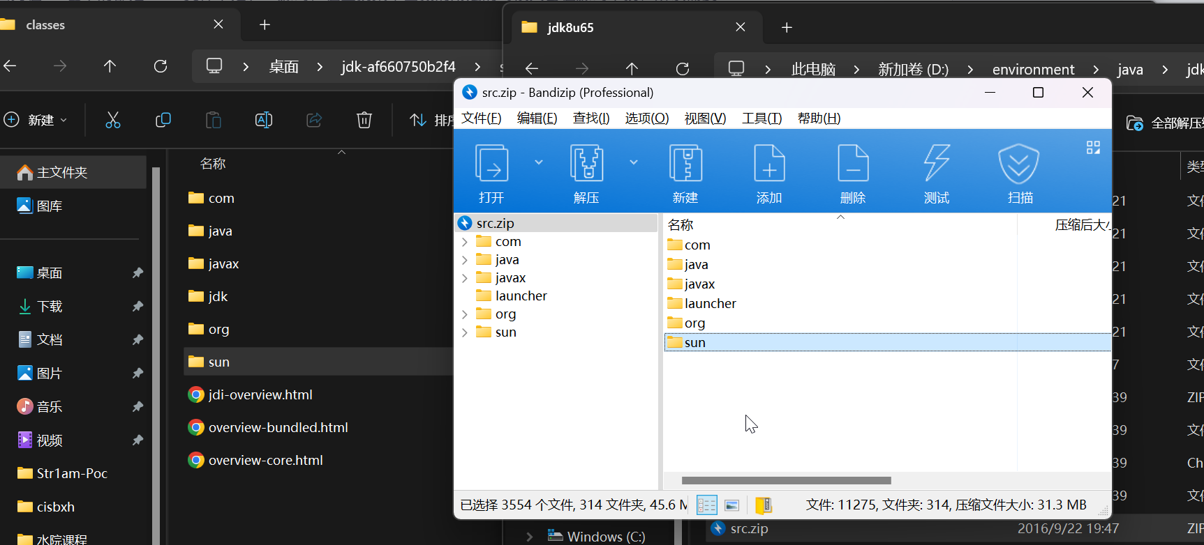 将刚刚下载的jdk8u65源码解压,然后将src\share\classes中的sun文件夹复制到jdk8u65安装目录下的src.zip中