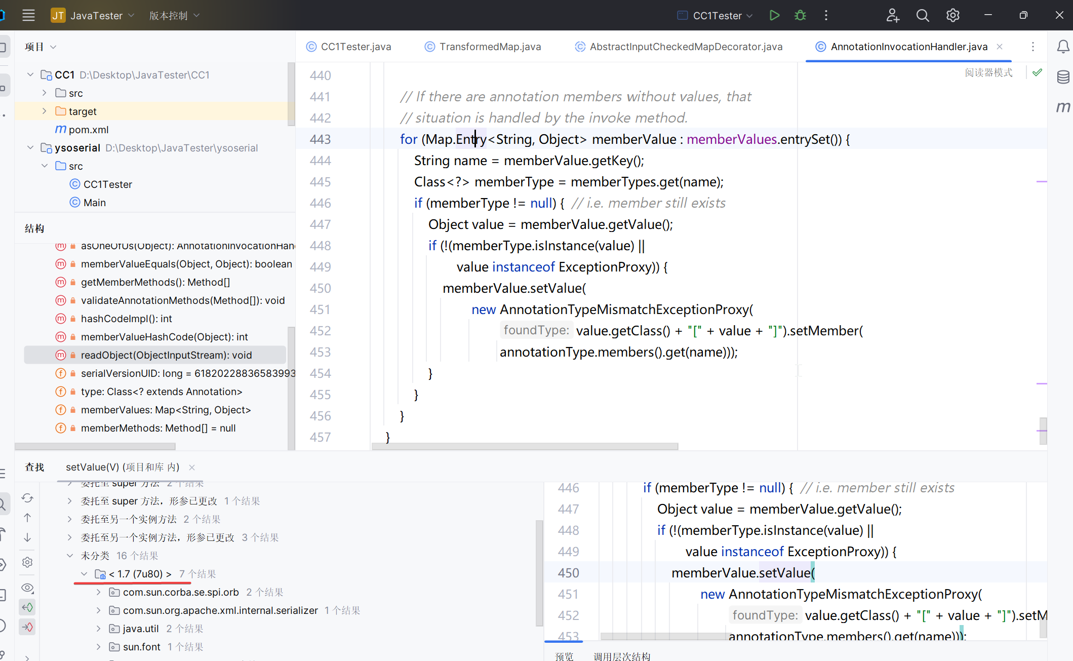 然后发现在readObject中调用了Map对象的entrySet方法 由此可以知道,只要AnnotationInvocationHandler建立Map的动态代理,然后将动态代理对象作为Map对象传入新的AnnotationInvocationHandler对象中,等到执行memberValues.entrySet()时就会先去AnnotationInvocationHandler中的involke中执行get方法,然后再回到LazyMap的get,就执行了transform