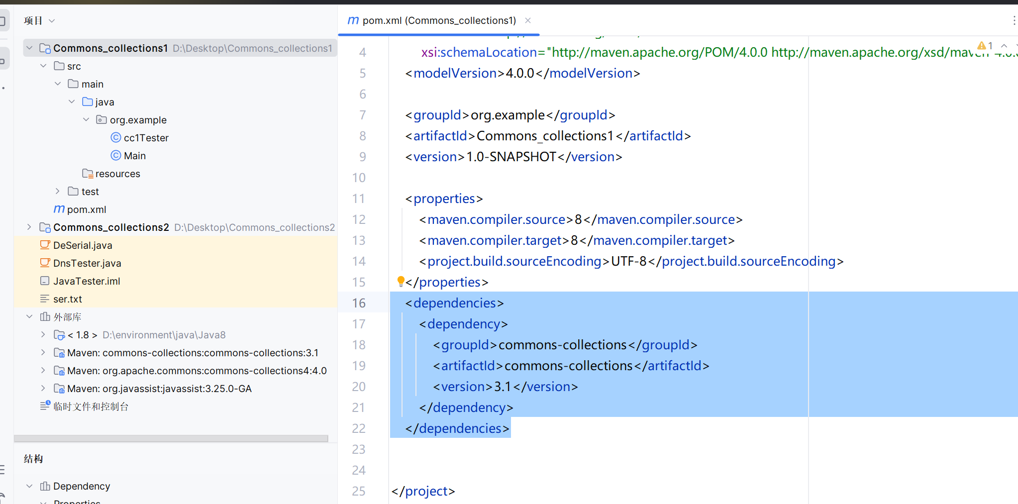 1 2 3 4 5 6 7 <dependencies> <dependency> <groupId>commons-collections</groupId> <artifactId>commons-collections</artifactId> <version>3.1</version> </dependency> </dependencies>