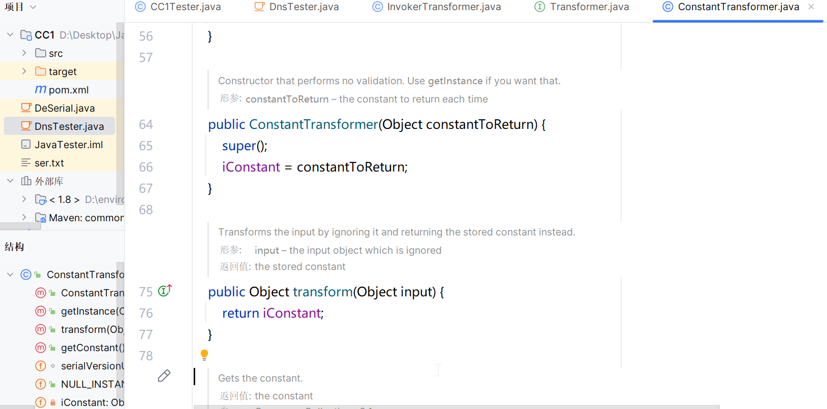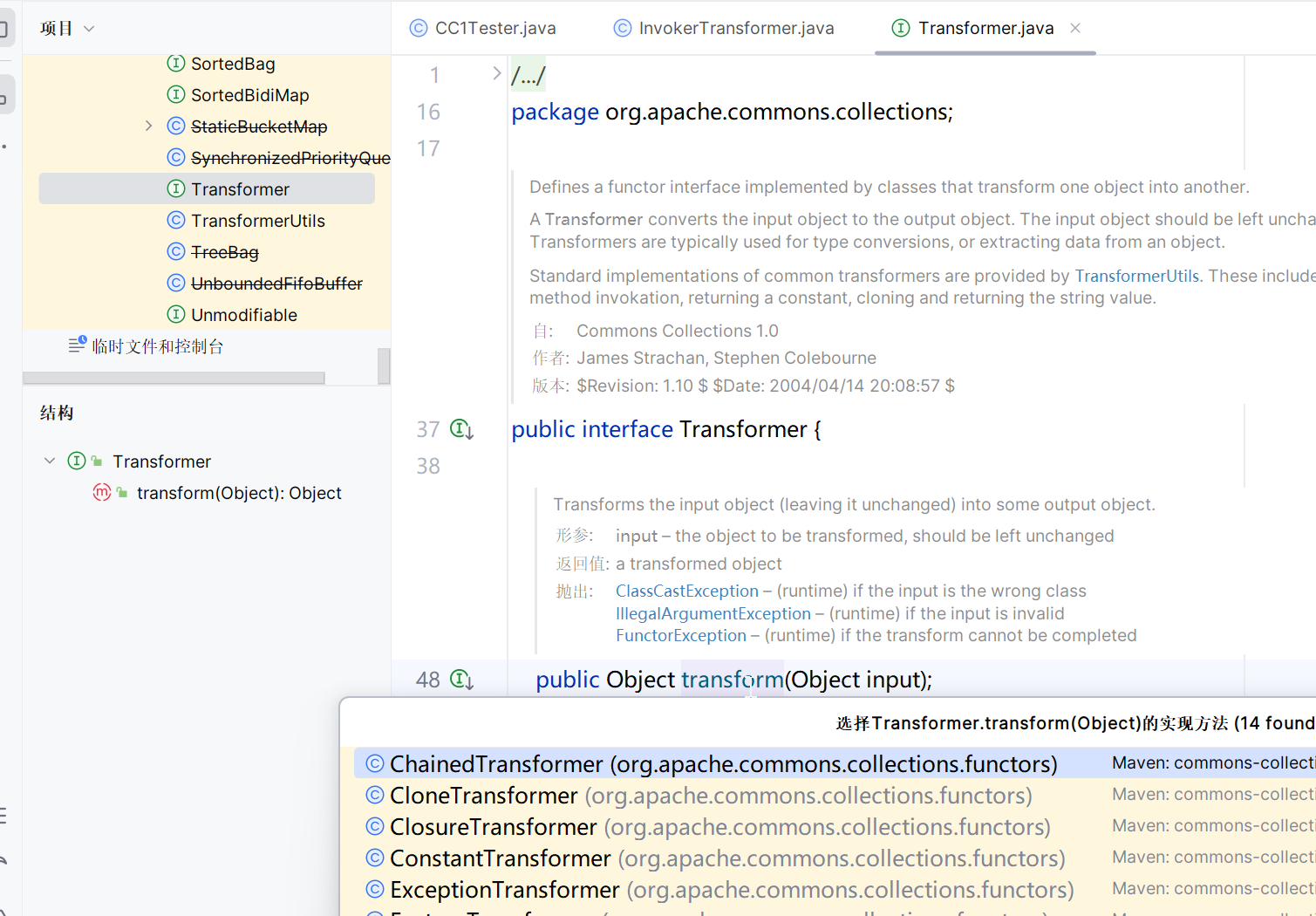 利用链分析 在commons collections中有一个Transformer接口 ,其中包含一个transform方法,通过实现此接口来达到类型转换的目的。我们看一下有哪些类实现了这个接口,直接鼠标停留在Transformer接口的transformer方法上,然后按住ctrl+alt+B,就可以看到所有实现了