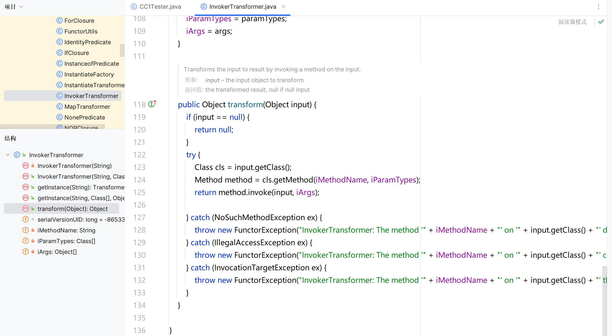 1 2 3 4 5 6 7 8 9 10 11 12 13 14 15 16 17 public Object transform(Object input) { if (input == null) { return null; } try { Class cls = input.getClass(); Method method = cls.getMethod(iMethodName, iParamTypes); return method.invoke(input, iArgs); } catch (NoSuchMethodException ex) { throw new FunctorException("InvokerTransformer: The method '" + iMethodName + "' on '" + input.getClass() + "' does not exist"); } catch (IllegalAccessException ex) { throw new FunctorException("InvokerTransformer: The method '" + iMethodName + "' on '" + input.getClass() + "' cannot be accessed"); } catch (InvocationTargetException ex) { throw new FunctorException("InvokerTransformer: The method '" + iMethodName + "' on '" + input.getClass() + "' threw an exception", ex); } }