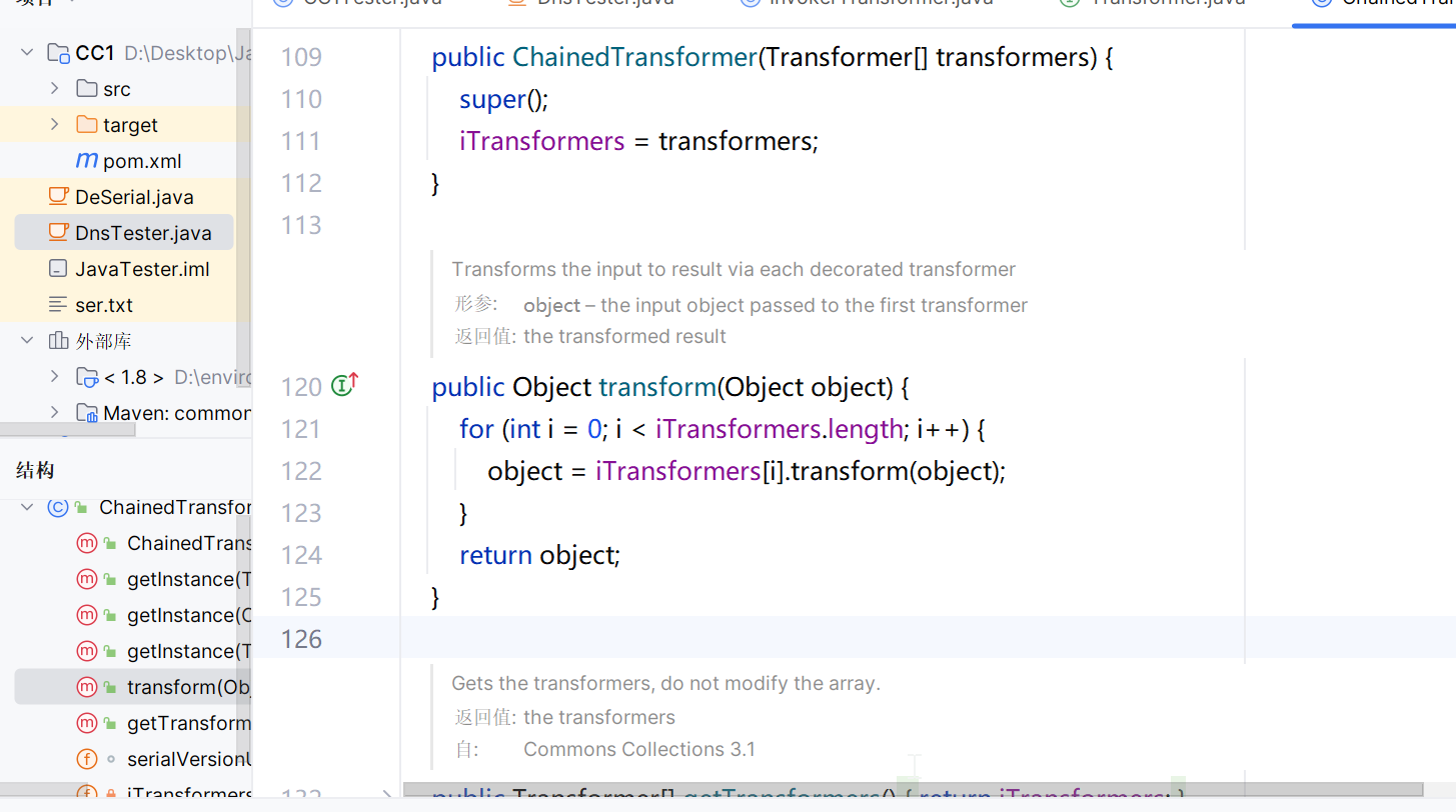 因为需要寻找调用transform方法的类,所以转到Transformer接口中,鼠标选中transform方法,按住ctrl+alt+B,发现了有一个ChainedTransformer的类中的transformer方法如下