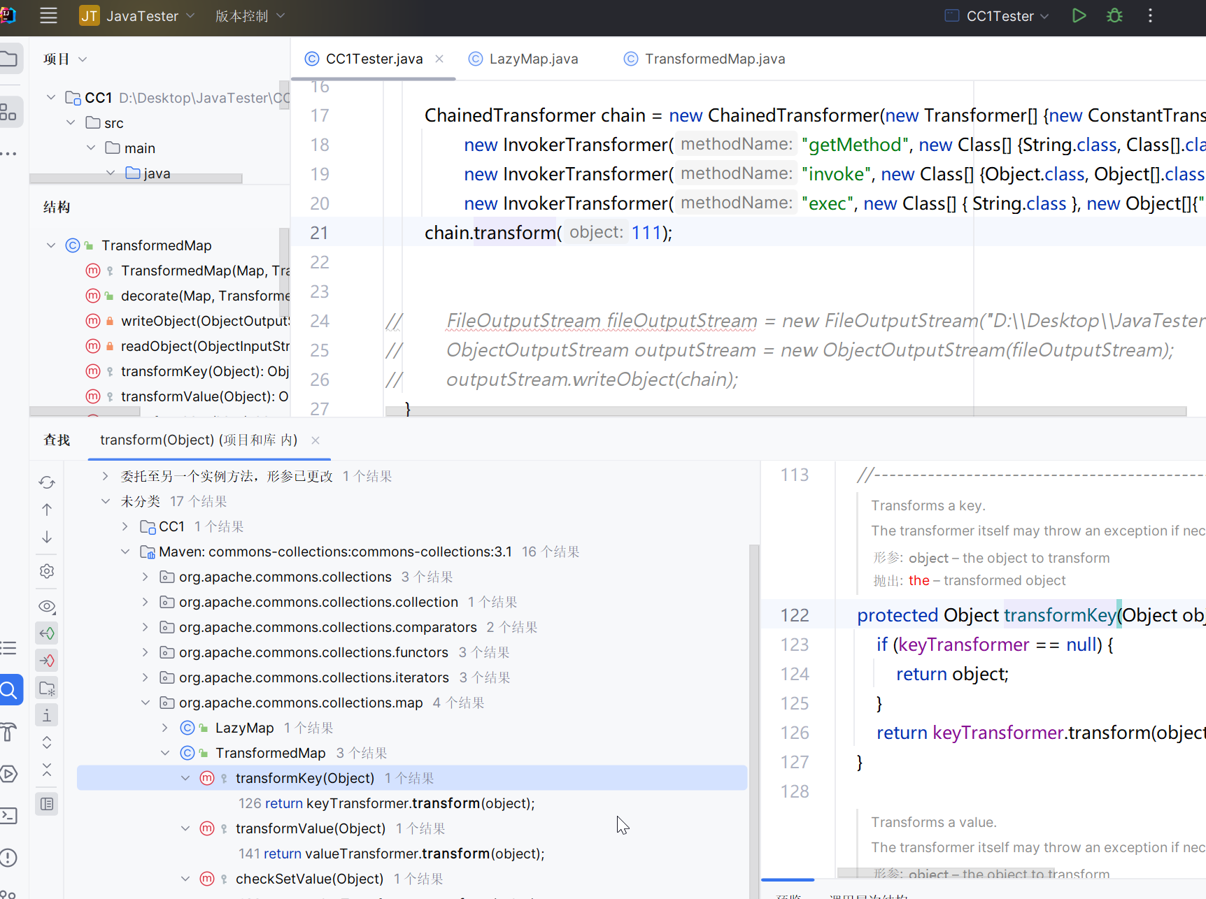 找到直接调用InvokerTransformer类的transform方法的对象或者是方法