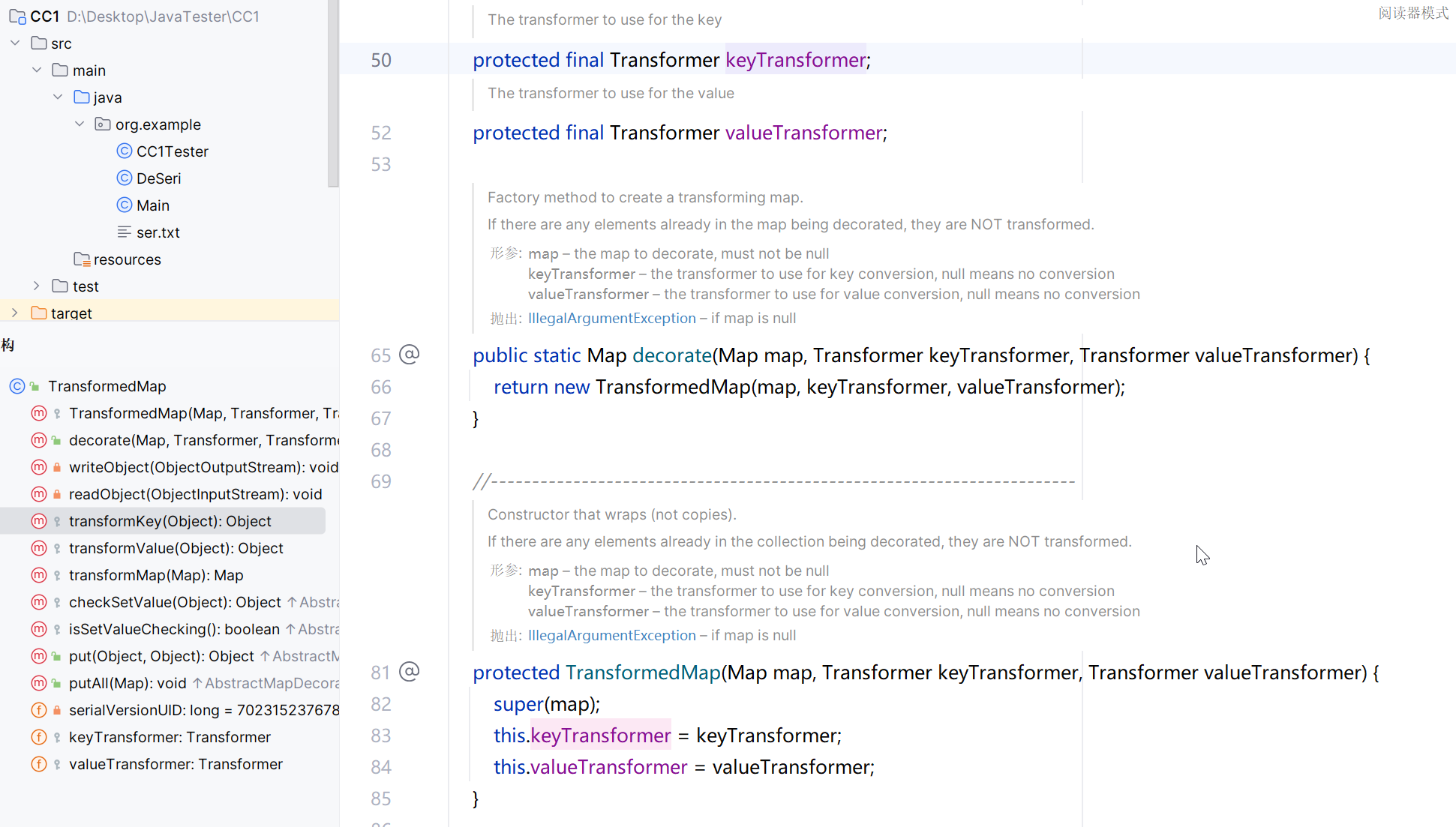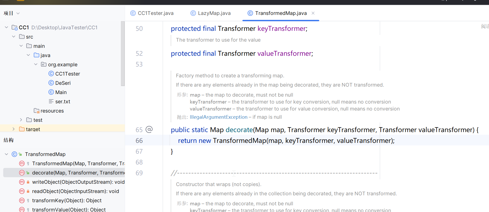 里面有一个decorate方法和TransformedMap类中的decorate方法一样也是帮助我们创建Lazymap对象的,所以按照参数创建即可,如此只要由readObject调用Map的get方法即可实现调用transform方法,即可执行我们的恶意命令