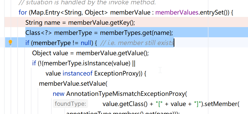 1 2 3 4 5 6 7 8 9 10 11 12 13 14 15 for (Map.Entry<String, Object> memberValue : memberValues.entrySet()) { String name = memberValue.getKey(); Class<?> memberType = memberTypes.get(name); if (memberType != null) { // i.e. member still exists Object value = memberValue.getValue(); if (!(memberType.isInstance(value) || value instanceof ExceptionProxy)) { memberValue.setValue( new AnnotationTypeMismatchExceptionProxy( value.getClass() + "[" + value + "]").setMember( annotationType.members().get(name))); } } }