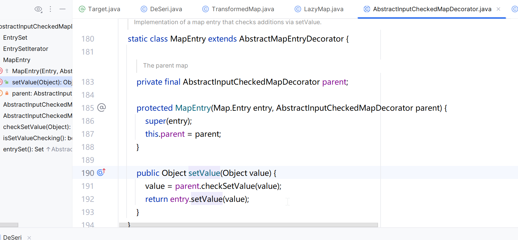 所以需要传入value,然后就会继续往下执行,直到调用setValue,然后又因为transformerMap继承于AbstractInputCheckedMapDecorator接口,然后里面重写了MapEntry类的setValue方法