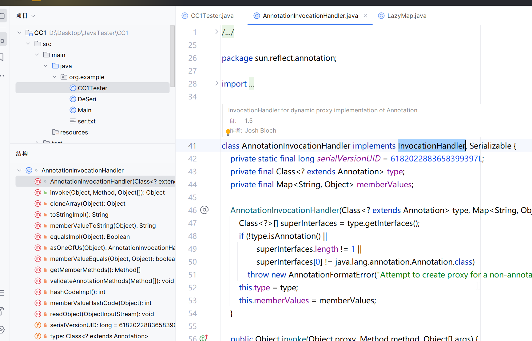 AnnotationInvocationHandler实现了InvocationHandler,由动态代理的知识 可以想到AnnotationInvocationHandler可以建立动态代理