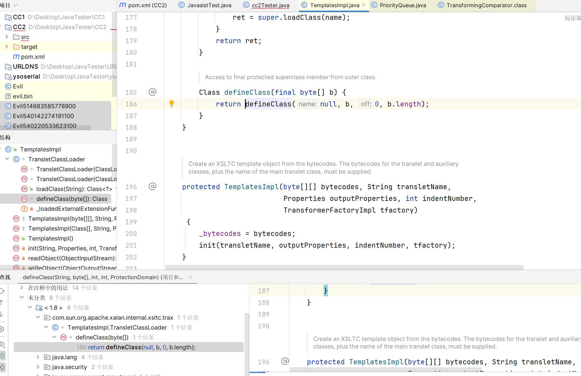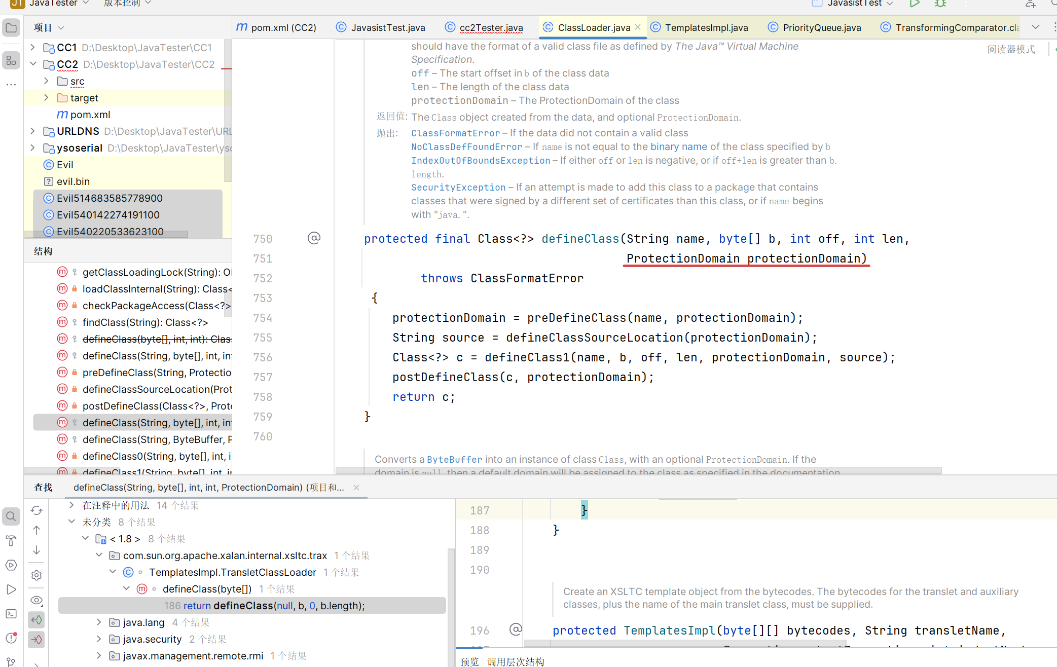 鼠标停在defineClass方法上按住alt+F7 查找所有的重载方法,找到了接下来要介绍的TemplatesImpl类