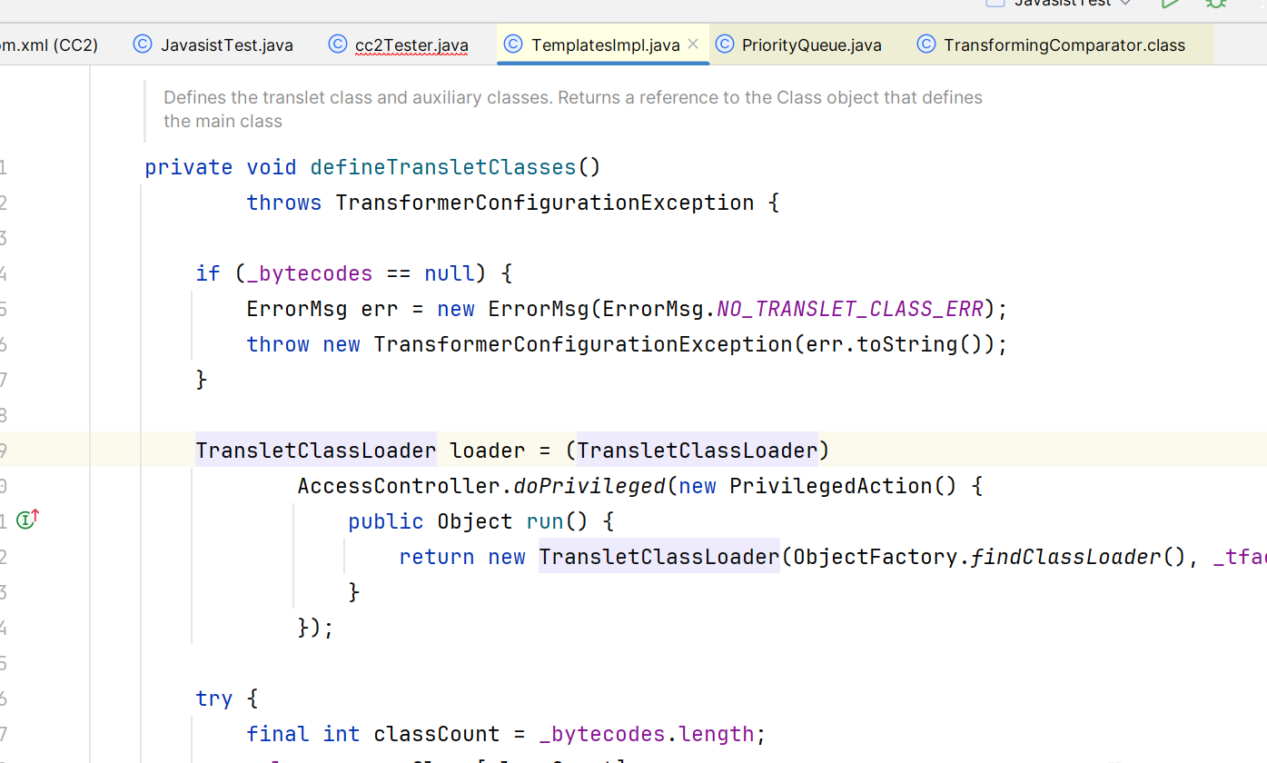 先查看调用TransletClassLoader的方法 defineTransletClasses方法调用了TransletClassLoader