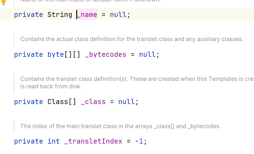 可以看到需要实现两个条件,一个是_bytecodes不为null,其实就是要传入我们的恶意类的字节码,一个是父类要是ABSTRACT_TRANSLET,他们的类型和值如下所示