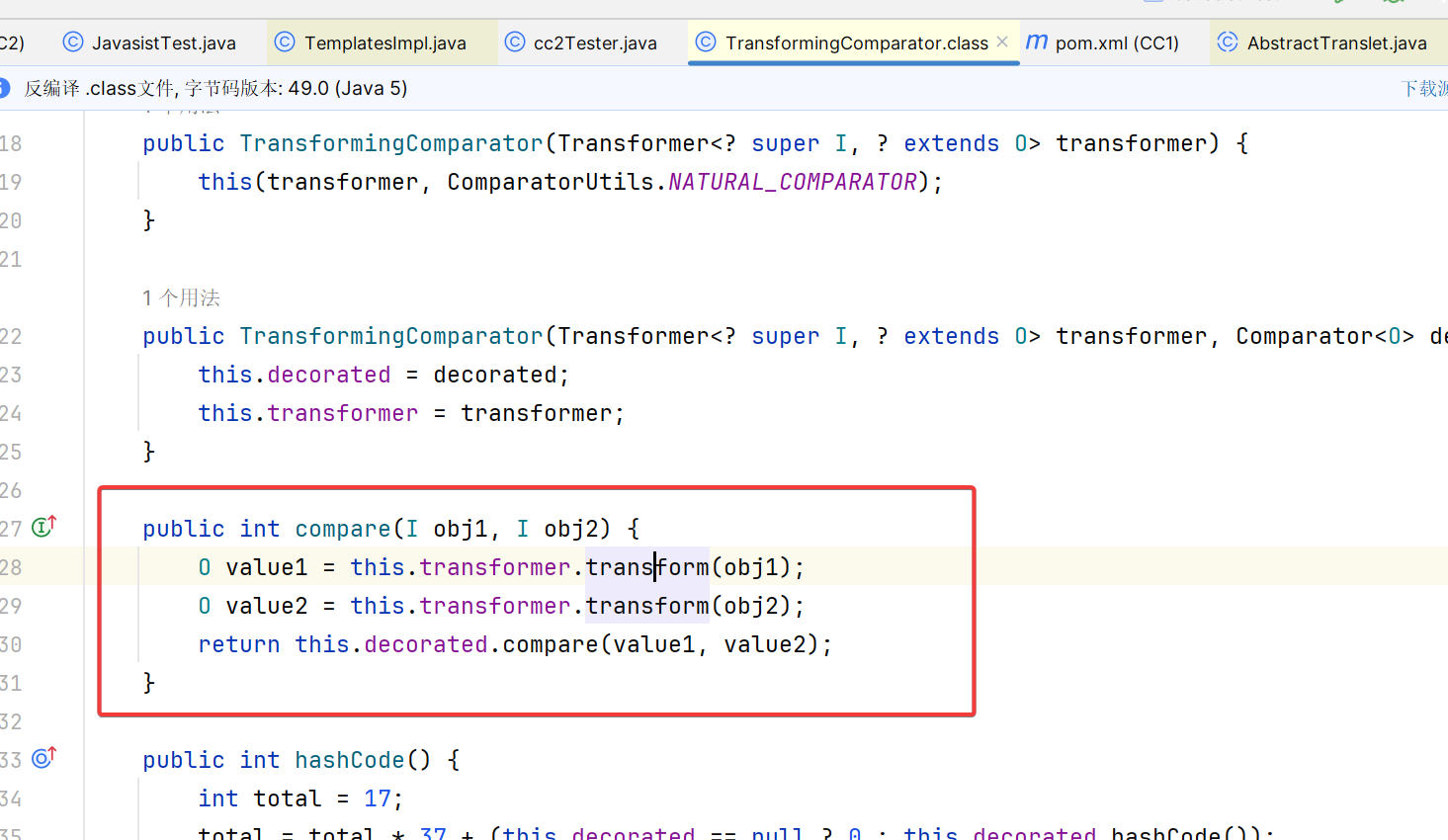 代码1 InvokerTransformer.transform()和cc1中的一样,就是通过反射执行指定对象的函数,所以我们可以将这个TemplatesImpl中的newTransformer()方法传入其中