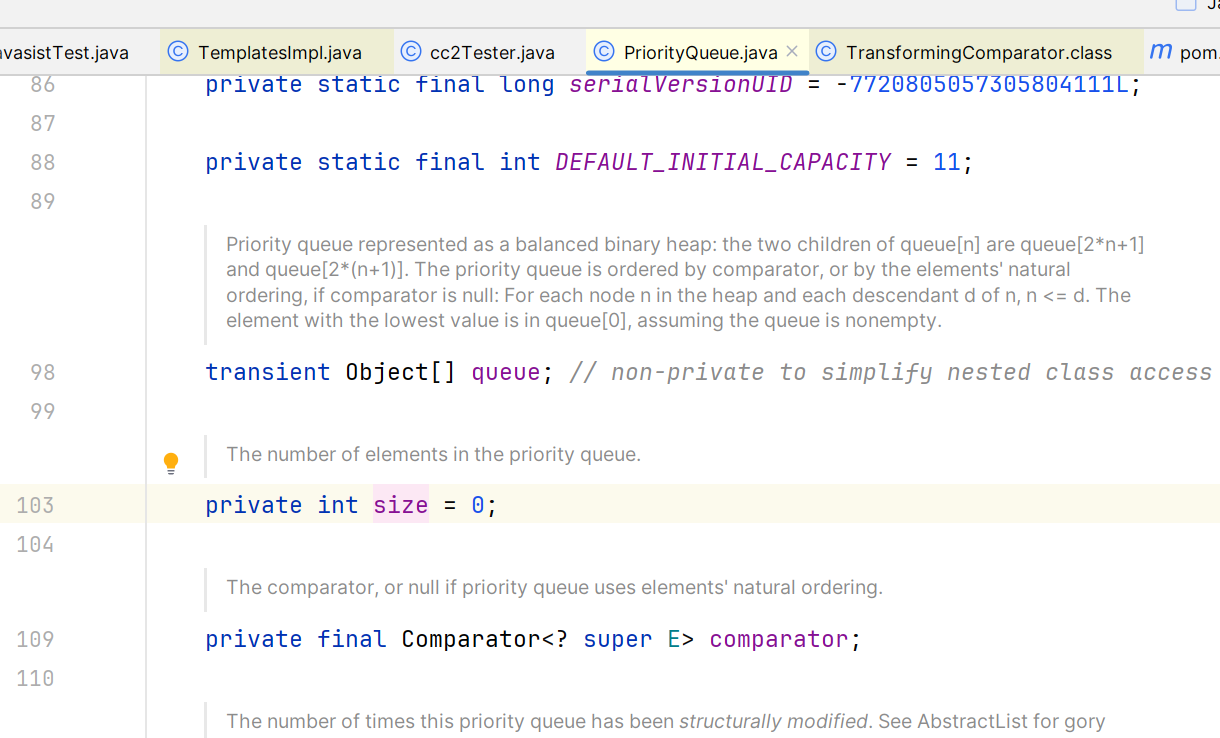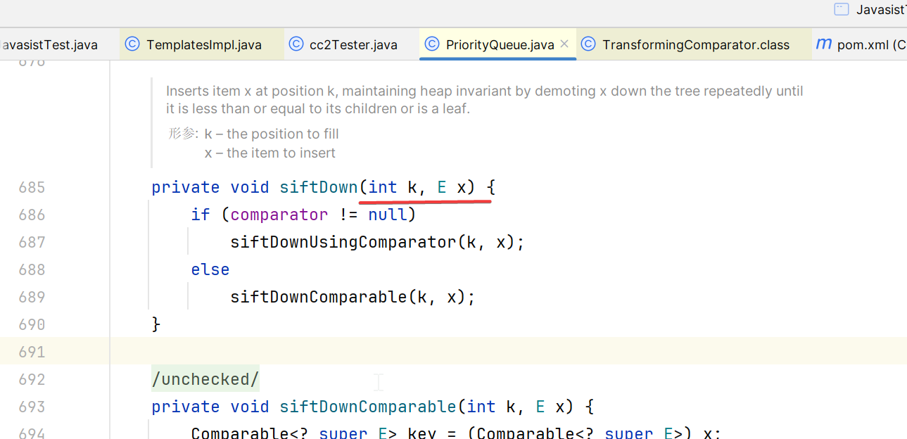 查找谁调用了siftDownUsingComparator()方法,发现是siftDown()方法,并且参数有x 它的逻辑是如果comparator不为null就调用这个函数,所以我们需要使用反射修改这个值为 TransformingComparator对象