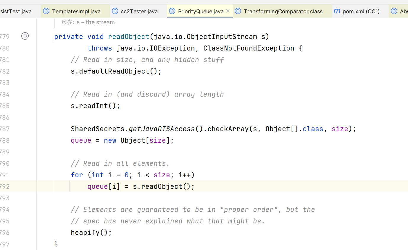 注意 :这里一开始因为queue前面有transient修饰让我有一些疑惑,加了这个关键字后这个不是不能进行序列化操作了吗?但是发现它是将queue里面的对象进行的序列化和反序列化,所以我想对我们的利用是没有影响的吧(纯推想,欢迎指正😉)