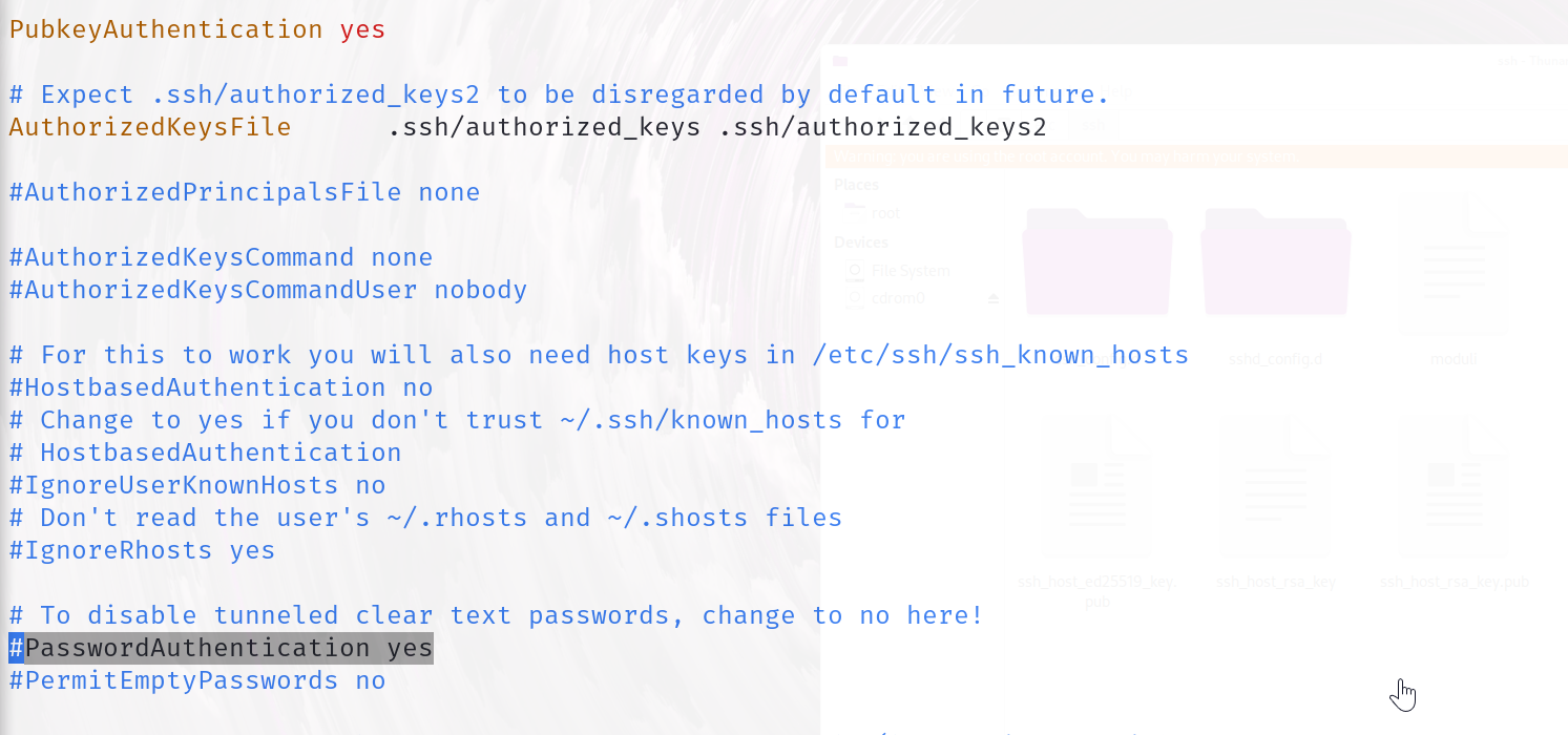 将PasswordAuthentication取消注释,并且改成no,若是不修改的话则会既需要密码,也需要公钥登录