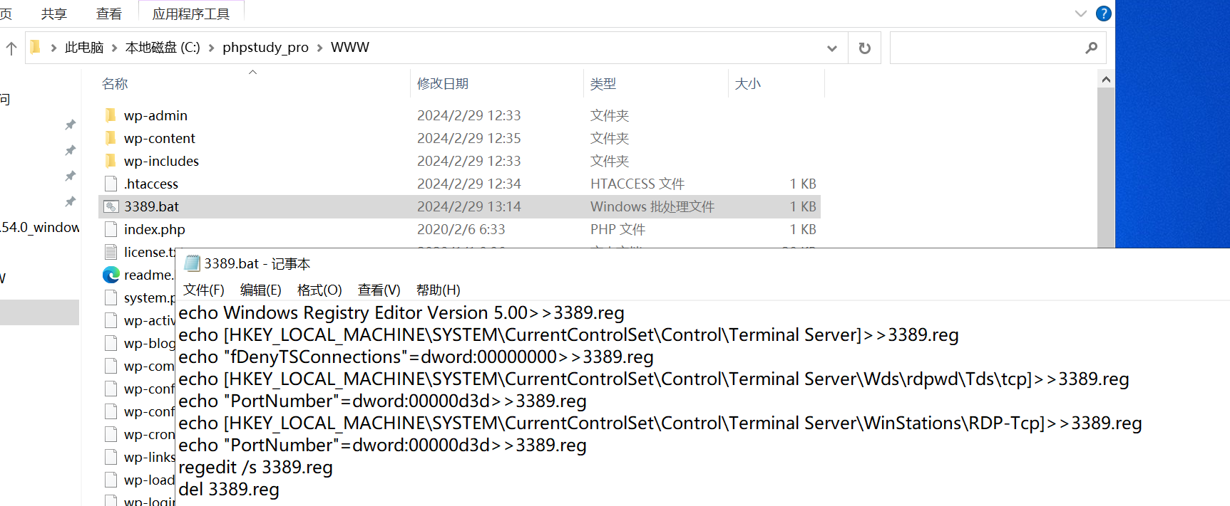 系统又是使用小皮搭建的网站,打开网站的根目录发现了一个3389.bat的可疑文件