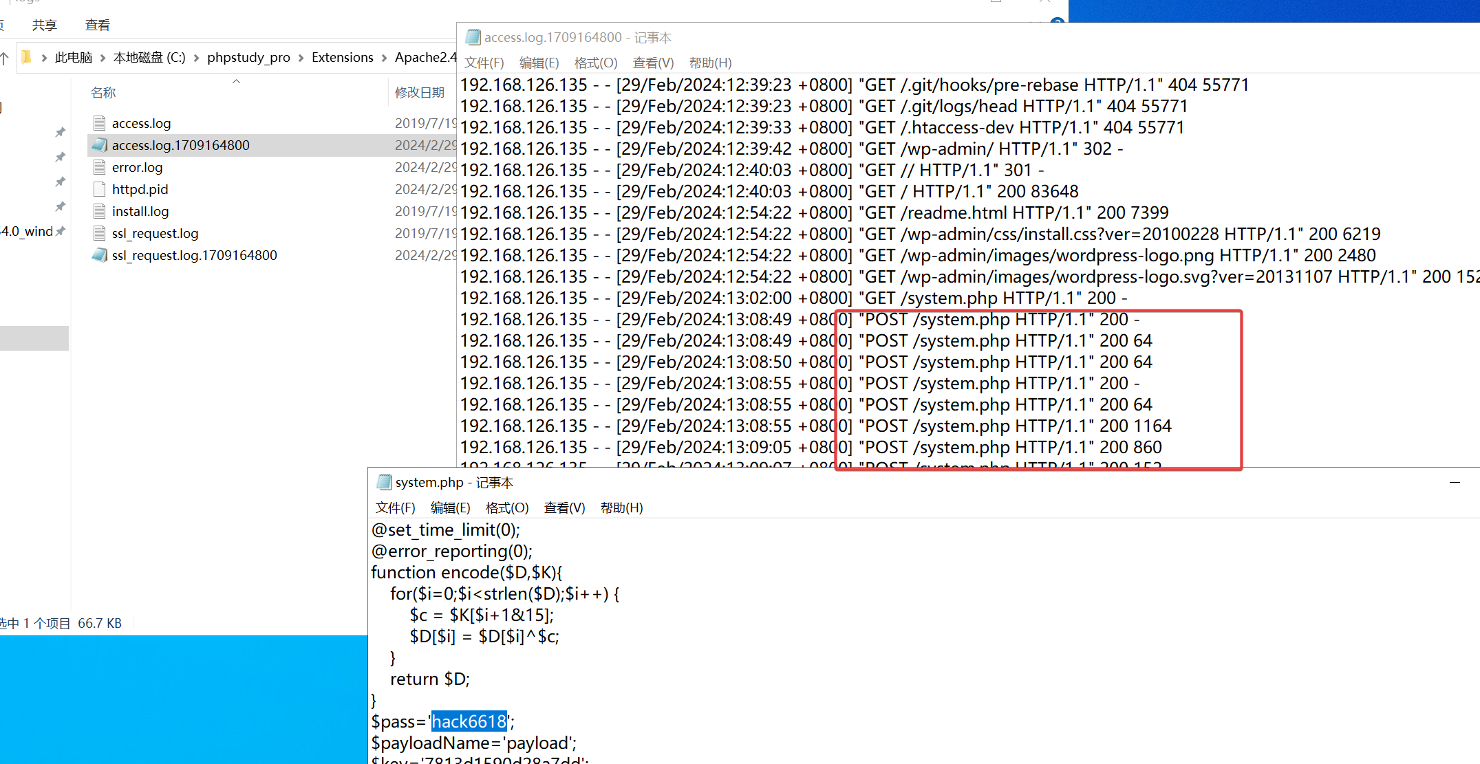 apache中有日志记录,发现如下一直请求system.php文件,这文件肯定有问题,查看根目录下的system.php文件果然发现就是木马文件