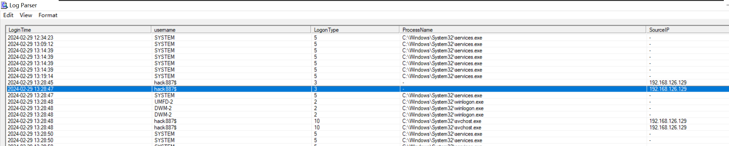 LogParser.exe -i:EVT -o:DATAGRID "SELECT TimeGenerated as LoginTime,EXTRACT_TOKEN(Strings,5,'|') as username,EXTRACT_TOKEN(Strings, 8, '|') as LogonType,EXTRACT_TOKEN(Strings, 17, '|') AS ProcessName,EXTRACT_TOKEN(Strings, 18, '|') AS SourceIP FROM Security where EventID=4624 AND TO_DATE(TimeGenerated) between timestamp('2021-03-01', 'yyyy-MM-dd') and timestamp('2024-10-27', 'yyyy-MM-dd')" -rtp:-1