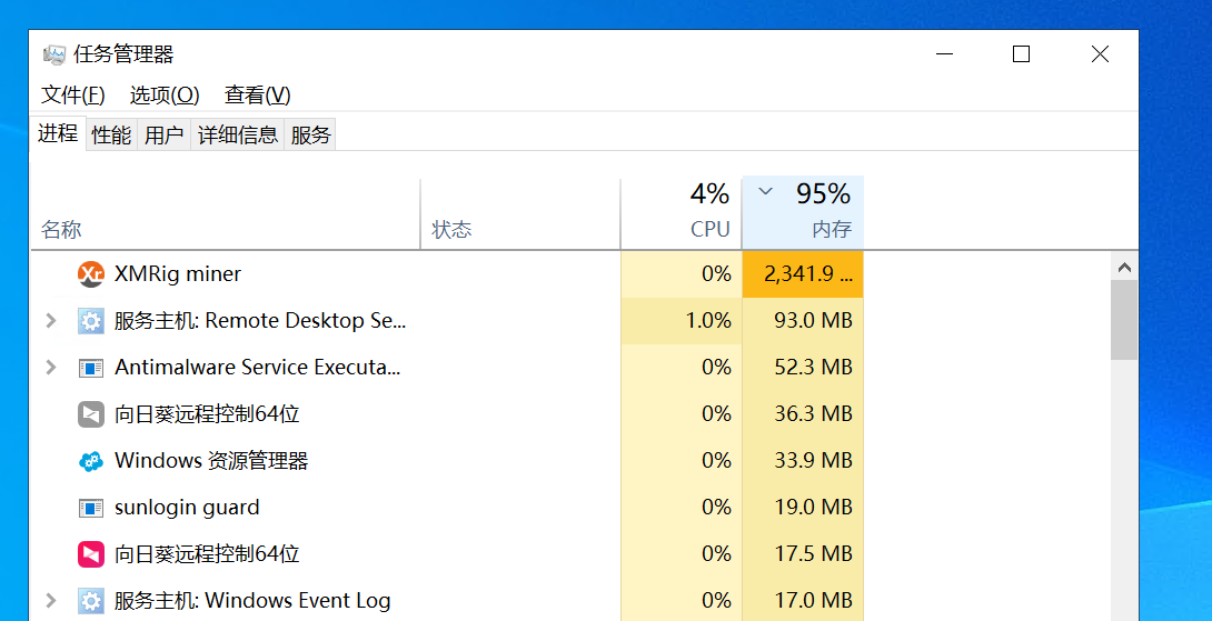 发现XMRig miner程序占用内存过高,估计就是挖矿程序