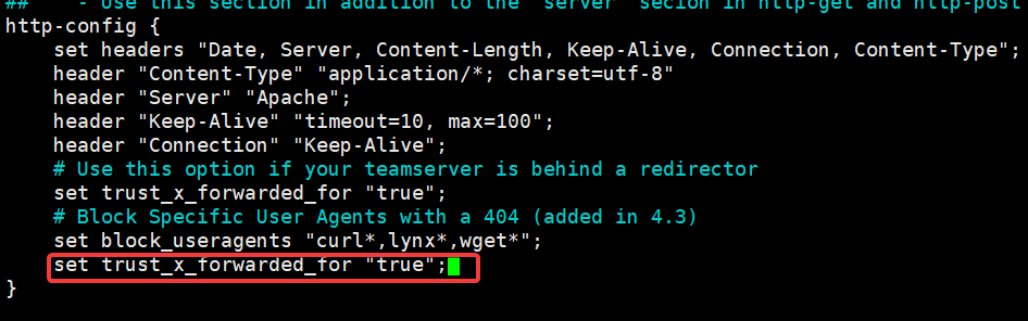 在pofile中的如下位置添加如下的header,这个设置可以获得上线主机的真实IPset trust_x_forwarded_for "true";